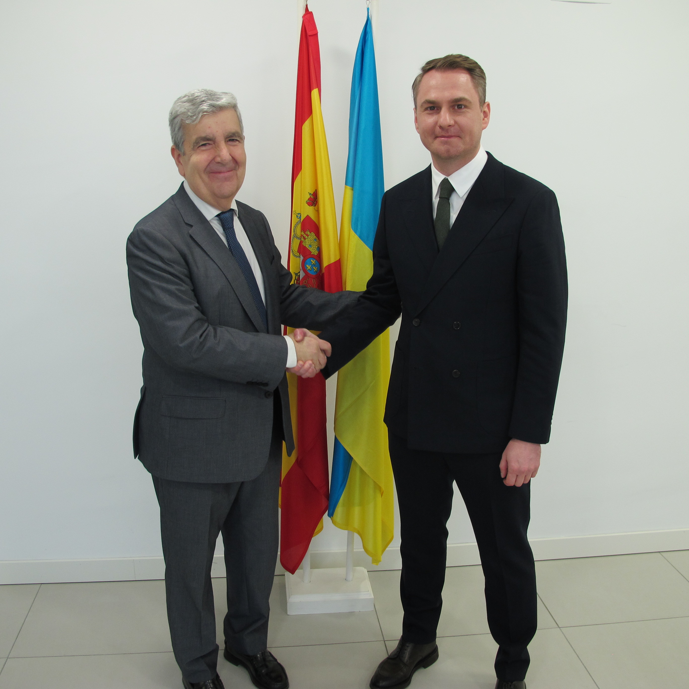 El presidente de la Audiencia Nacional, Juan Manuel Fernández, y el fiscal general de Ucrania, Ruslan Kravchenko