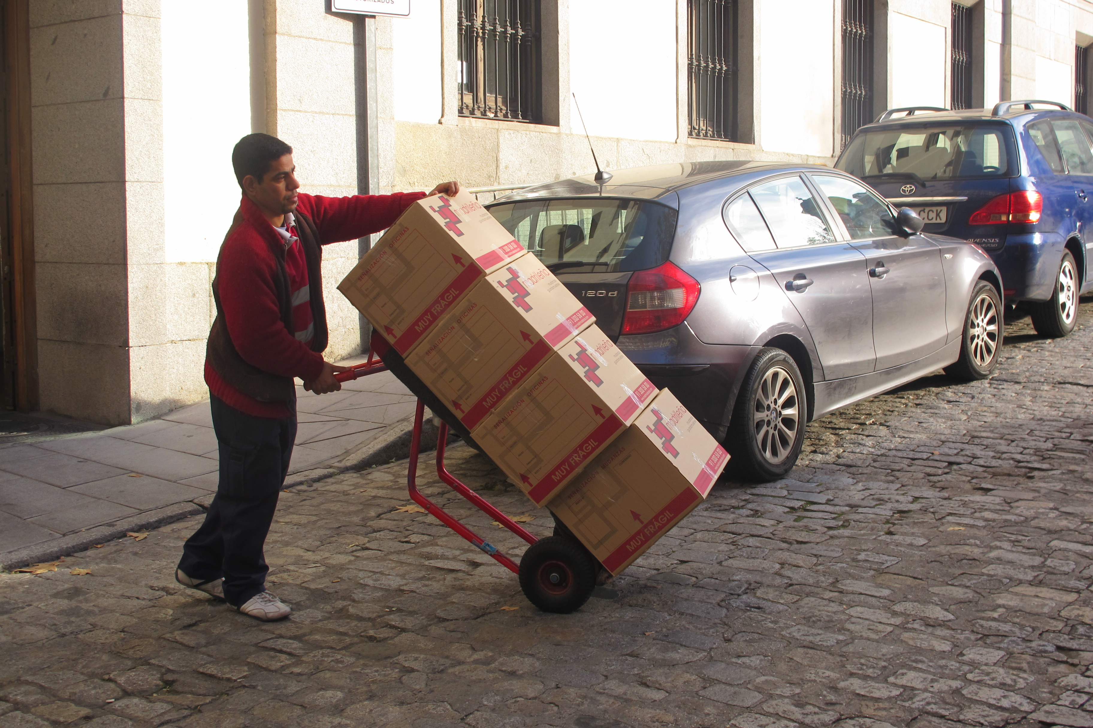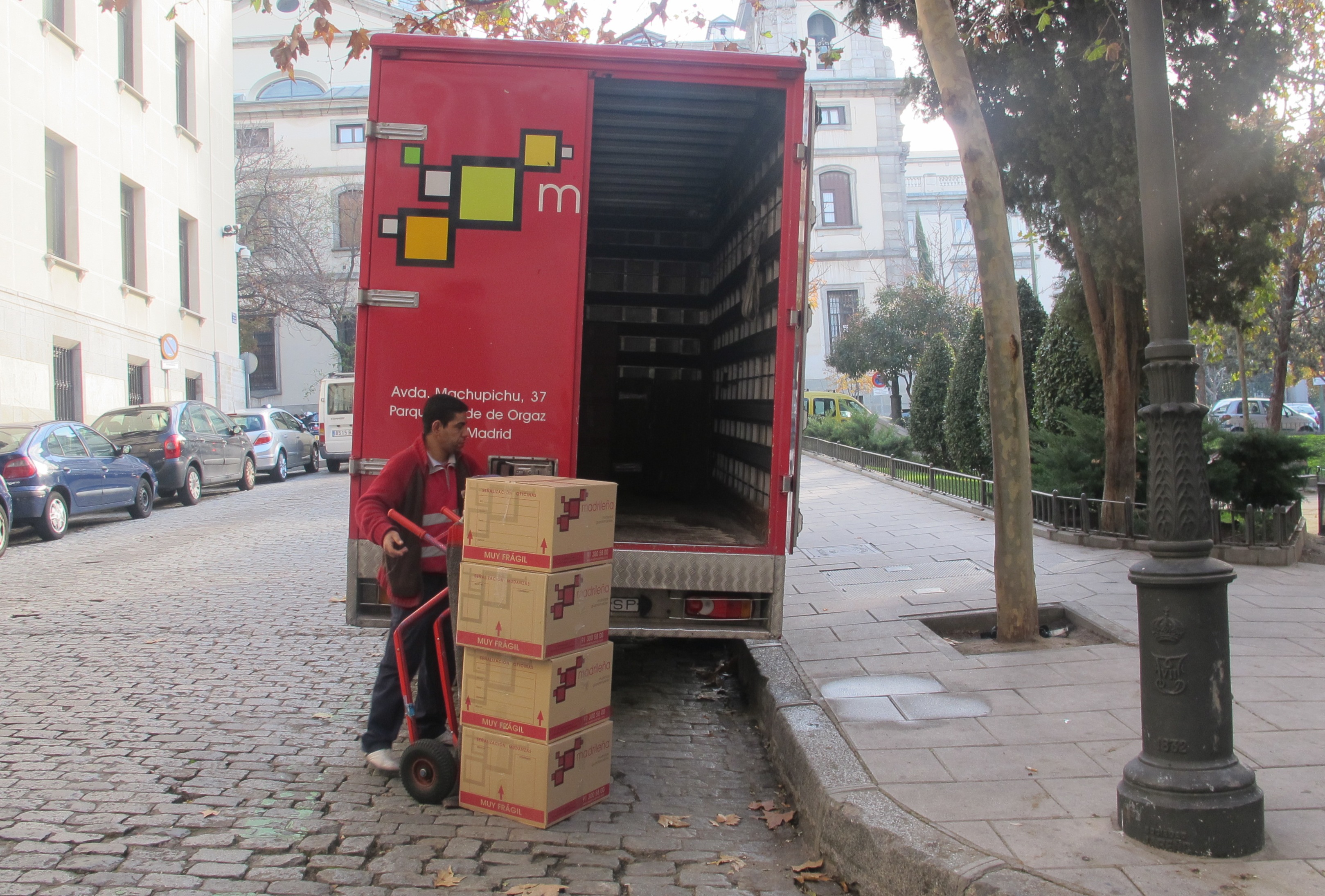Un operario lleva las primeras cuatro cajas a la furgoneta que va a la Audiencia Nacional.