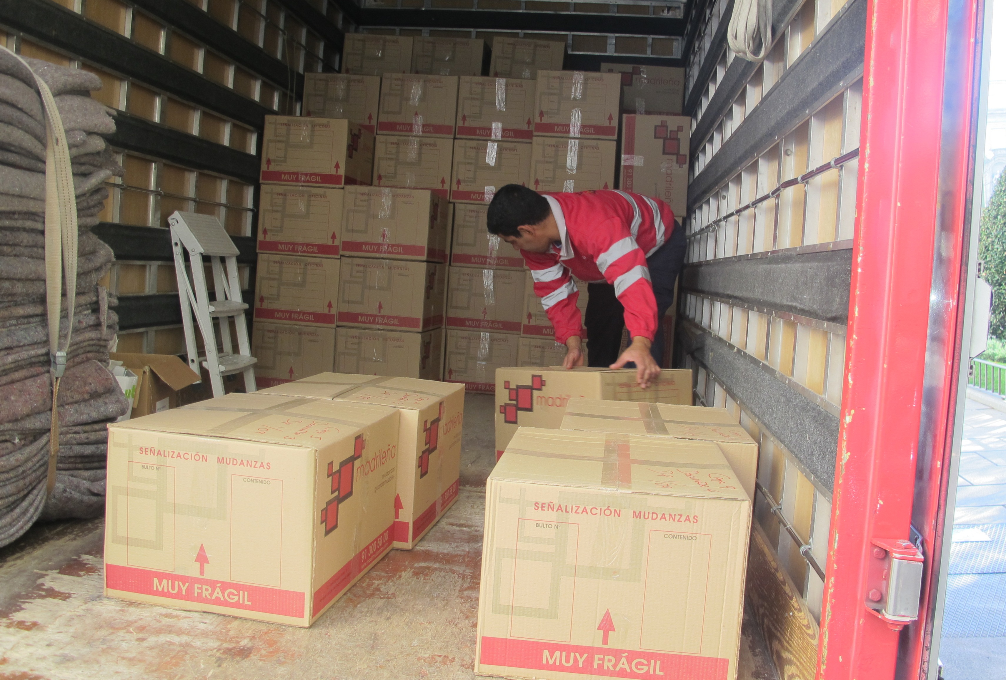 Las cajas van apilándose en el interior de la furgoneta encargada del traslado.