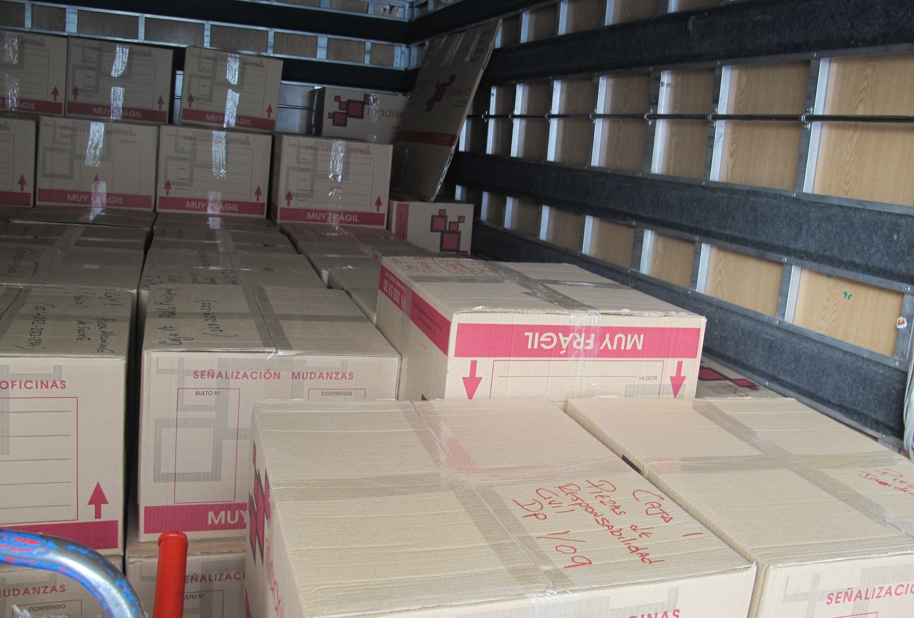 Momento en que las primeras cajas van a subirse a la furgoneta con destino a la Audiencia Nacional.
