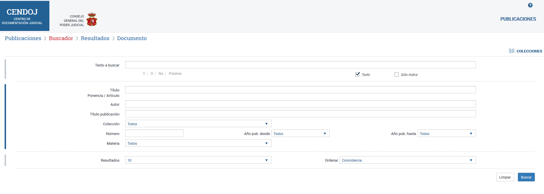 En este panel se encuentra el formulario de búsqueda que recupera publicaciones emitidas por el CGPJ. Utilice los distintos campos de filtrado para formar un criterio de búsqueda.