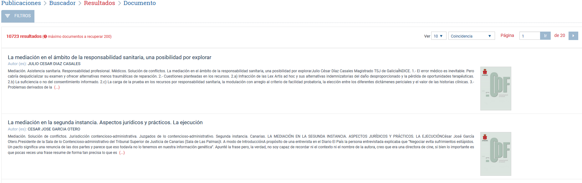 Mediante el desplegable de Resultados el usuario podrá elegir el número de documentos por página que se mostrarán en el resultado 10, 20, 30 o 50.